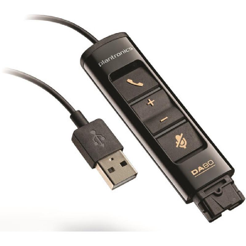 Jednoduchý USB adaptér DA80 poslouží pro připojení vašich náhlavních souprav řady H nebo HW k vašemu počítači. Adaptér je na jedné straně zakončen USB konektorem a na druhé straně QD konektorem pro připojení soupravy. V adaptéru jsou zabudována ovládací tlačítka pro ovládání hovoru, hlasitosti a mikrofonu.