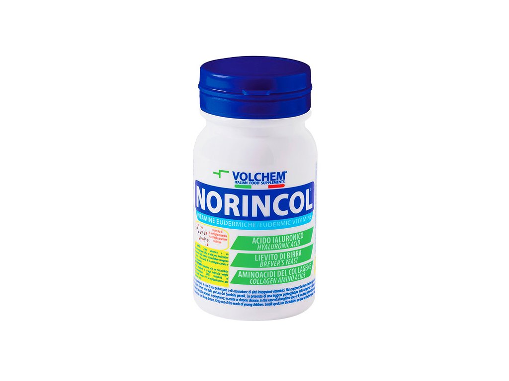 Norincol je doplněk stravy s komplexem vitamínů (A, C, niacin, biotin). Dále obsahuje aminokyseliny Prolin, Lysin a kyselinu Hyaluronovou.