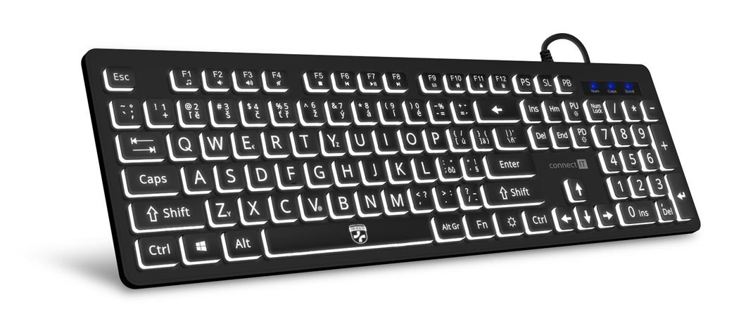 - CONNECT IT FOR HEALTH LargeFont klávesnice s velkým fontem, podsvícená/USB/CZ + SK verze, ČERNÁ