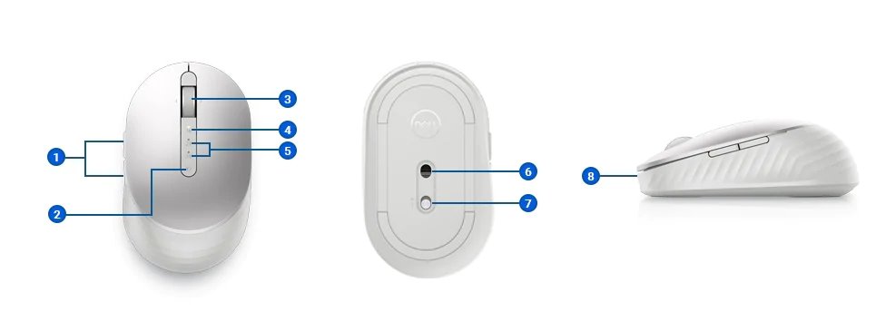 1. Programovatelná tlačítka | 2. Tlačítko režimu připojení | 3. Rolovací kolečko (programovatelné: naklonění doleva, kliknutí, naklonění doprava) | 4. Režim párování: RF 2,4GHz | 5. Režim párování: Bluetooth 5.0 | 6. Optický snímač | 7. Vypínač | 8. Nabíjecí port USB-C