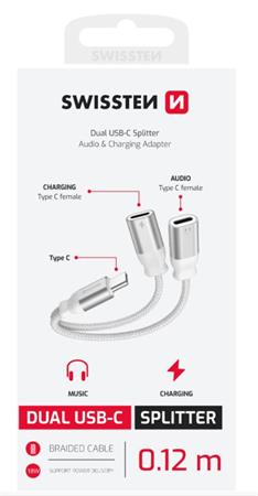 - SWISSTEN NABÍJECÍ AUDIO ADAPTÉR TEXTILE USB-C (samec) / 2x USB-C (samice) 0,12 M BÍLÝ